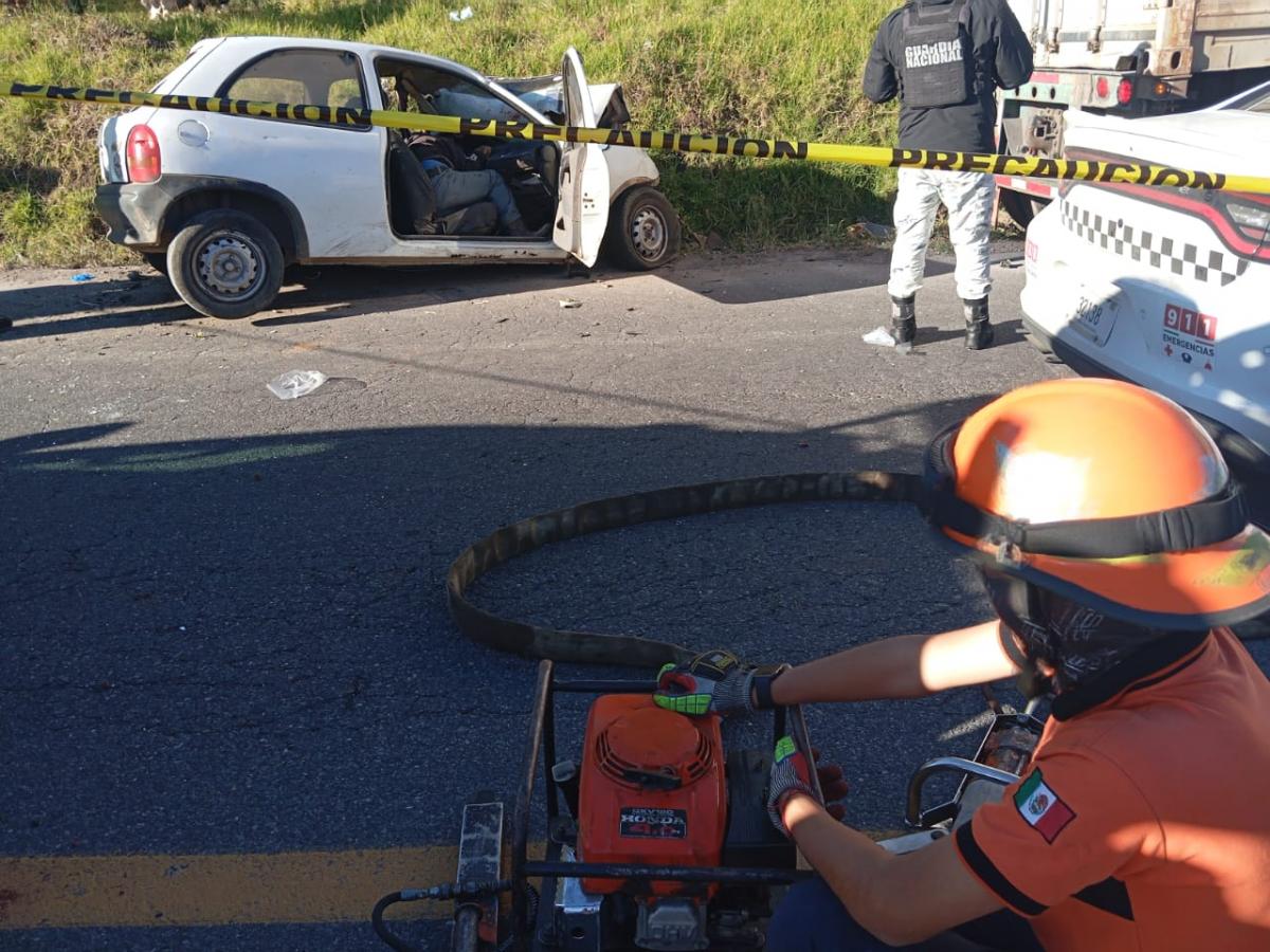 De acuerdo con los primeros reportes, un automóvil Chevy blanco invadió el carril contrario e impactó de frente contra un tráiler. El golpe fue tan fuerte que ambas unidades quedaron en el carril opuesto; el auto compacto terminó atrapado entre la cuneta y el tractocamión.