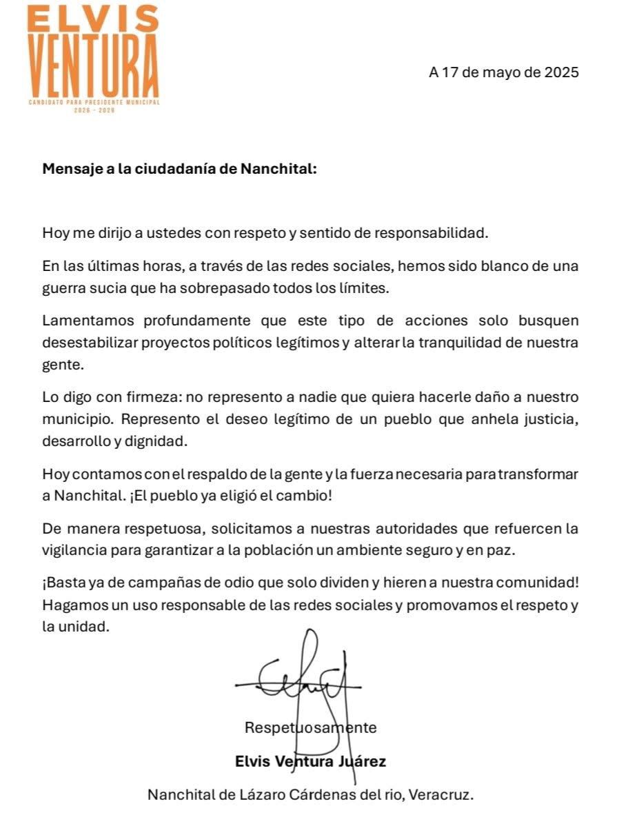 Nanchital, Ver. - Después de la difusión, en redes sociales, de un video en el que se observa el asesinato de un hombre, presuntamente relacionado con grupos delictivos y supuestos vínculos con su campaña, el candidato de Movimiento Ciudadano (MC) a la alcaldía de Nanchital, Elvis Ventura Juárez, calificó los señalamientos como parte de una “guerra sucia” sin fundamento.