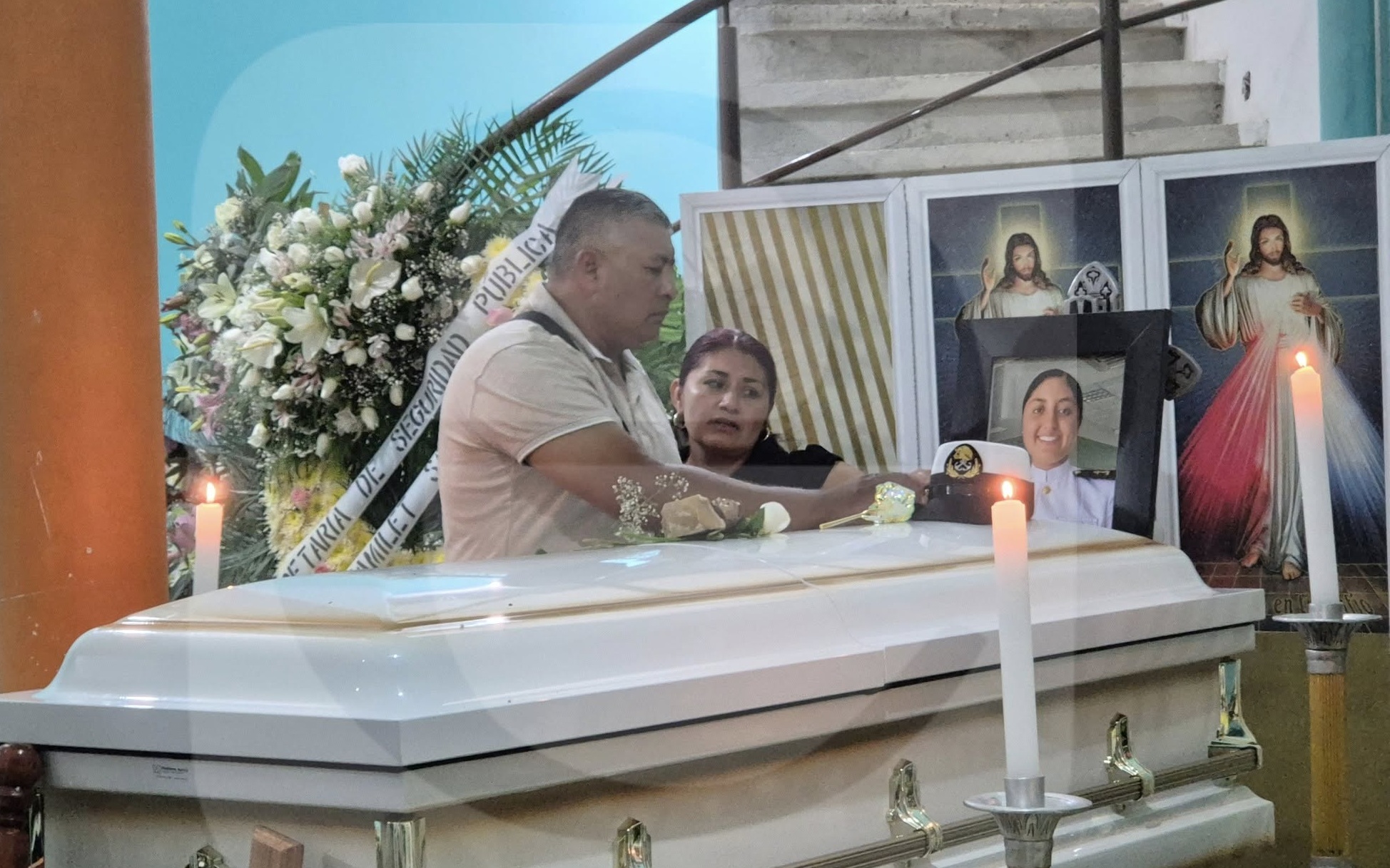 Alrededor del ataúd había flores blancas, girasoles, rosas rojas, lirios, así como fotografías con su uniforme naval, de sus 15 años, de los viajes que tuvo la oportunidad de realizar en distintos puertos y otra donde está en Central Park, Nueva York.
