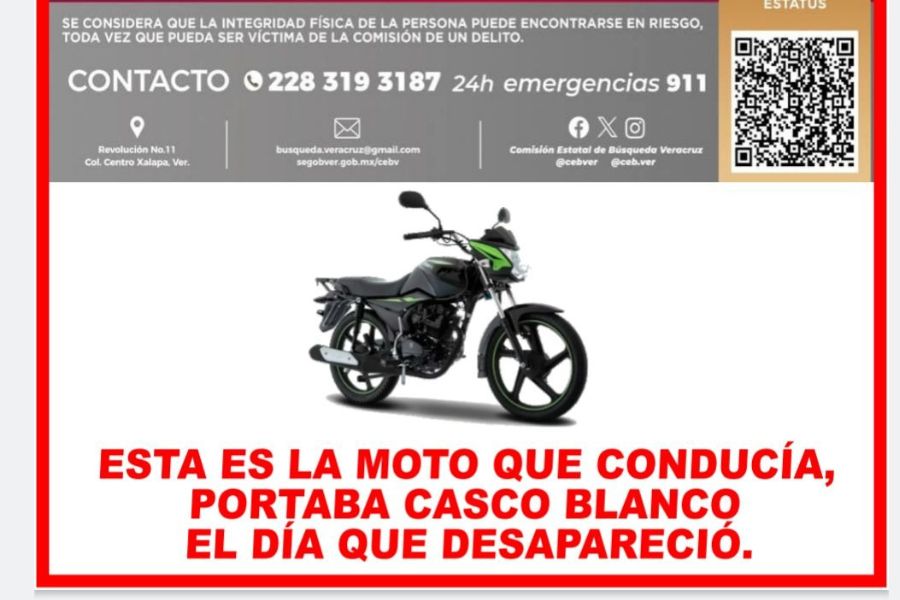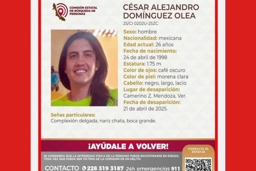 César Alejandro, quien tiene 27 años y se dedica a la música, fue visto por última vez cuando salió de su domicilio alrededor de las 9:00 de la noche en una motocicleta de color negro con detalles verdes. El joven portaba un casco de color blanco y llevaba un impermeable atado a la cintura.
