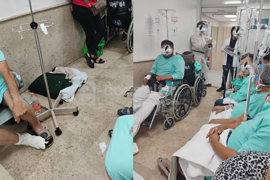 Las fotografías muestran a los derechohabientes vestidos con batas y algunos, incluso con el suero conectado a sus venas, mientras esperan para recibir atención por parte del equipo médico del hospital.