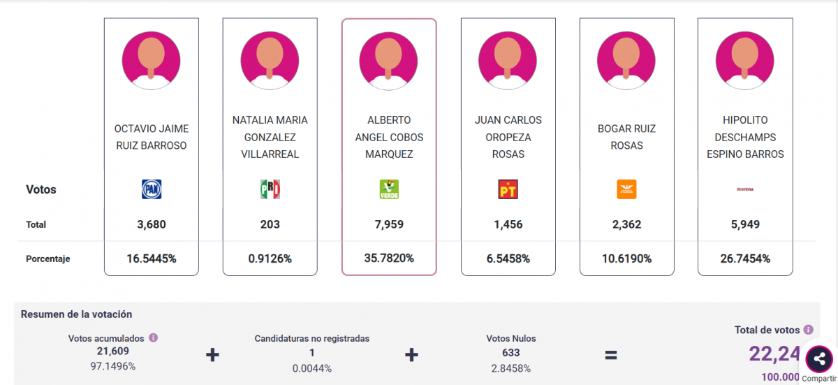 De acuerdo con el Programa de Resultados Electorales Preliminares (PREP) 2025, el candidato ganador con el 100 por ciento de las actas computadas es Alberto Ángel Cobos Márquez del Partido Verde Ecologista de México (PVEM) con 7959 votos que es el 35.78% de la participación ciudadana, mientras que Hipólito Deschamps Espino Barros obtuvo el 26.74% con 5949 votos, lo que representa una diferencia de 2010 sufragios.