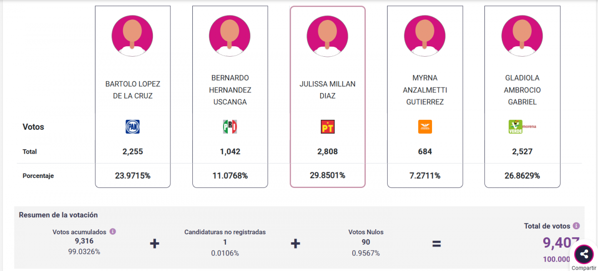 Con el 100% de las actas computadas, la ganadora de la contienda electoral fue la candidata del Partido del Trabajo (PT), Julissa Milán Díaz, con 2808 votos que representan el 29.85% de los sufragios.