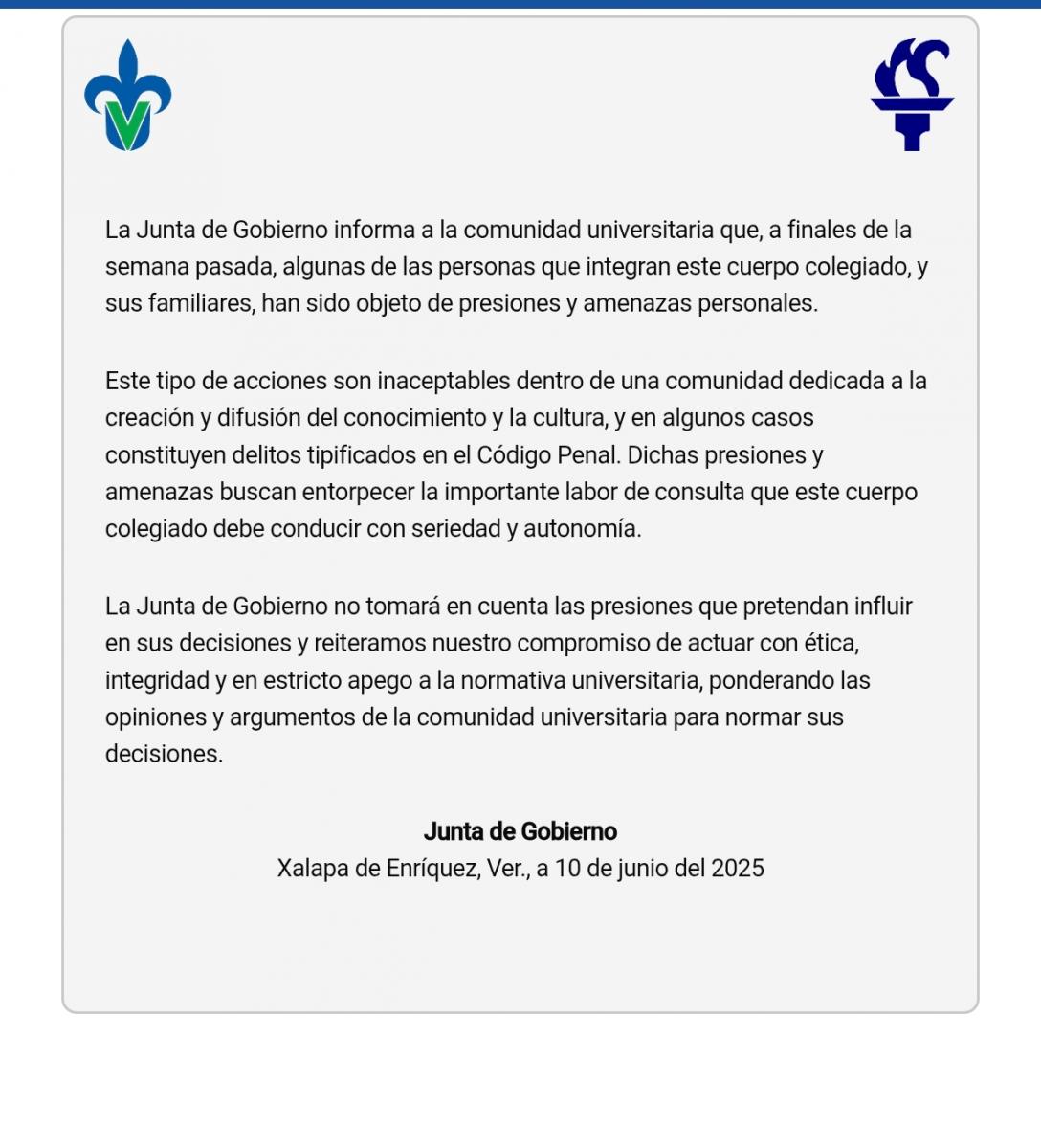 Xalapa, Ver.— La Junta de Gobierno de la Universidad Veracruzana (UV) emitió un comunicado el martes 10 de junio para denunciar que algunos de sus integrantes, así como sus familiares, han sido objeto de presiones y amenazas personales en días recientes.