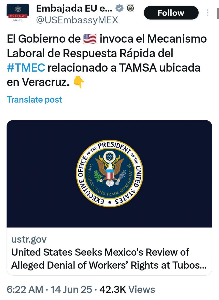 “El 13 de junio de 2025, Tubos de Acero de México, S.A. (TAMSA) tomó conocimiento de que el Representante Comercial de Estados Unidos (USTR) solicitó al Gobierno de México revisar si a los trabajadores de la planta de TAMSA en Veracruz, México, se les está negando el derecho a la libertad de asociación y negociación colectiva. La solicitud del USTR se realizó de conformidad con Acuerdo Estados Unidos-México-Canadá (T-MEC), a menudo denominado Mecanismo de Respuesta Rápida (MRR). TAMSA niega las objeciones que subyacen a esta solicitud.”, se lee en el comunicado.