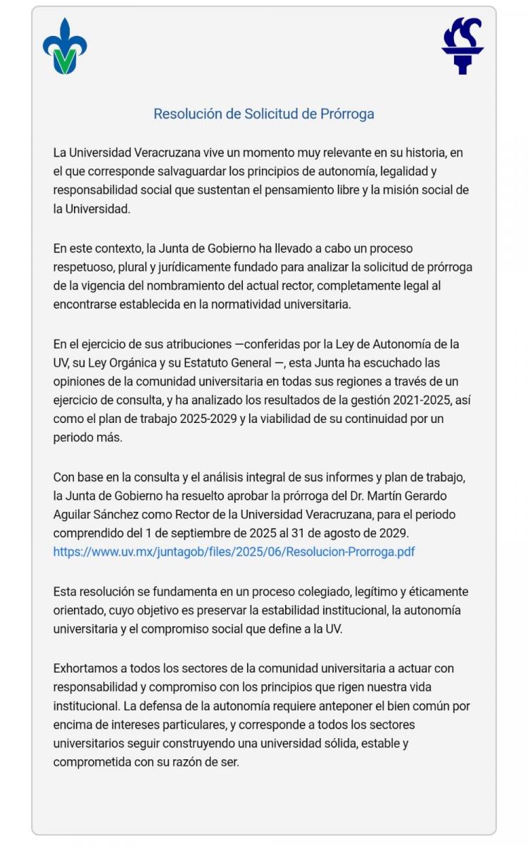 El comunicado completo está disponible en el sitio oficial de la Junta de Gobierno de la UV: https://www.uv.mx/juntagob/files/2025/06/Resolucion-Prorroga.pdf