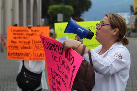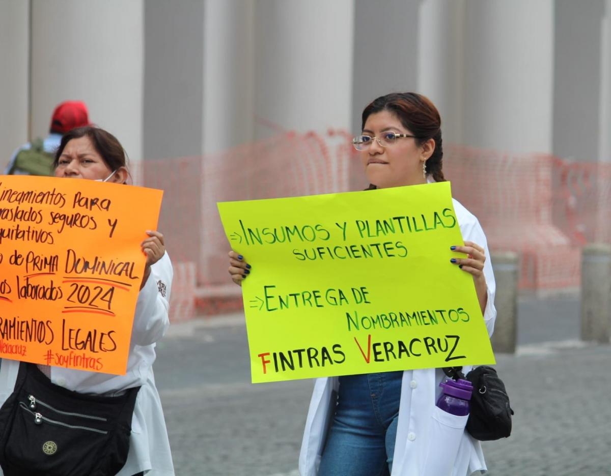 Xalapa, Ver. — Integrantes del Frente Independiente de Trabajadores de la Salud (Fintras) se manifestaron este martes 8 de julio en el centro de Xalapa para exigir el pago de bonos pendientes, el respeto a la asignación de plazas, la homologación de condiciones laborales y denunciar la falta de insumos y personal en hospitales del sistema IMSS Bienestar.