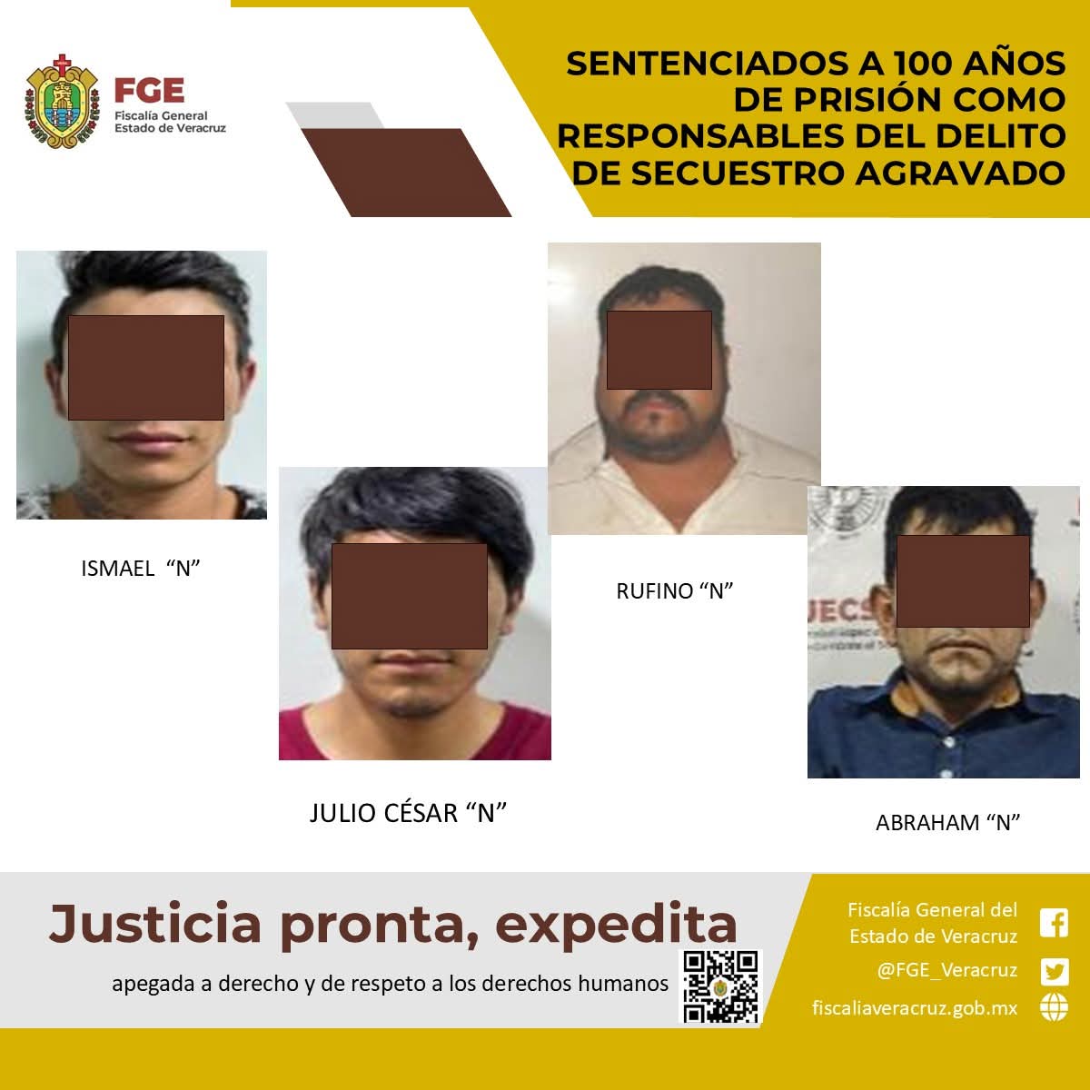 Los sentenciados, identificados como Ismael “N”, Julio César “N”, Rufino “N” y Abraham “N”, fueron encontrados responsables de privar ilegalmente de la libertad a la víctima el 15 de enero de 2020 en el municipio de Perote, a casi una hora de la ciudad de Xalapa.