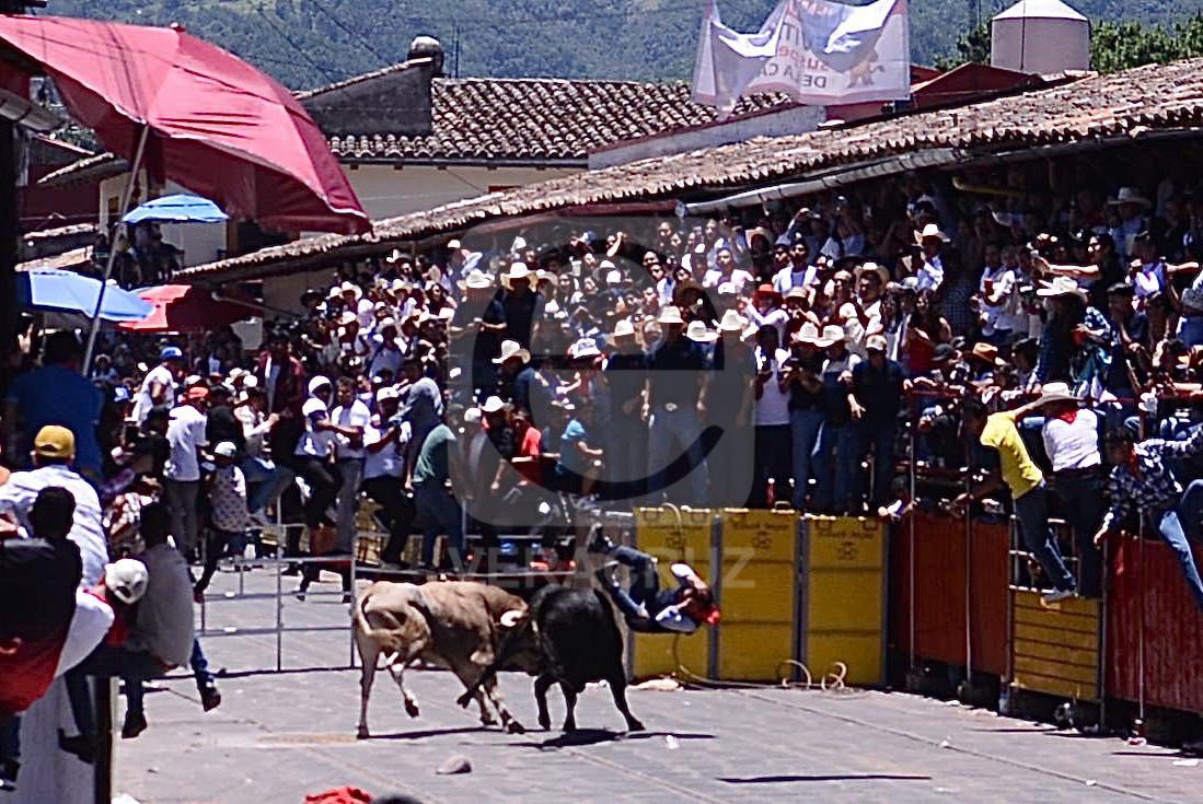 Xico, Ver.- Una boina cubría el rostro de Roberto, joven torero que mostró su destreza frente a cientos de turistas y pobladores de Xico que se reunieron en la calle principal del pueblo mágico durante los festejos patronales en honor a Santa María Magdalena.
