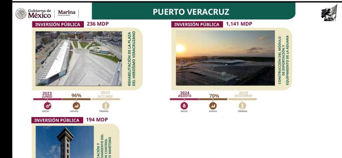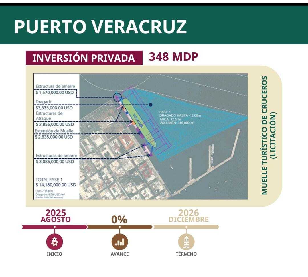 Con recursos privados se desarrollarán otras obras estratégicas. Entre ellas, la Terminal Marítima de Veracruz, que incluirá la construcción de dos silos. Su inicio está programado para diciembre de 2025 y concluirá en diciembre de 2030, con una inversión de 48 millones de pesos.