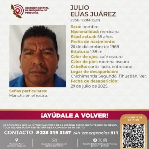 Los desaparecidos son Julio Elías Juárez, de 56 años, quien fue visto por última vez en la comunidad de Chichimantla Segundo. Julio mide 1 metro con 58 centímetros, tiene ojos color café oscuro, piel morena oscura, cabello corto, lacio y entrecano. Una seña particular es una mancha visible en el rostro.