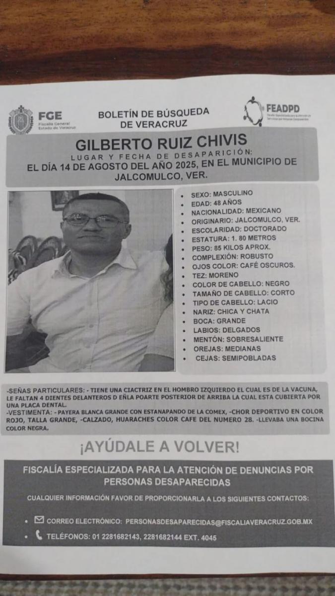 Xalapa, Ver. – Gilberto Ruiz Chivis, exalcalde de Jalcomulco por el Partido de la Revolución Democrática (PRD), fue reportado como desaparecido luego de que saliera a ejercitarse la mañana del jueves 14 de agosto de 2025 y no regresara a su vivienda.