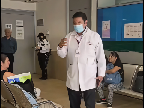 Casi al final de la grabación se observa que llega una persona en silla de ruedas y el doctor de inmediato le pide que pase a anotarse para su cita.