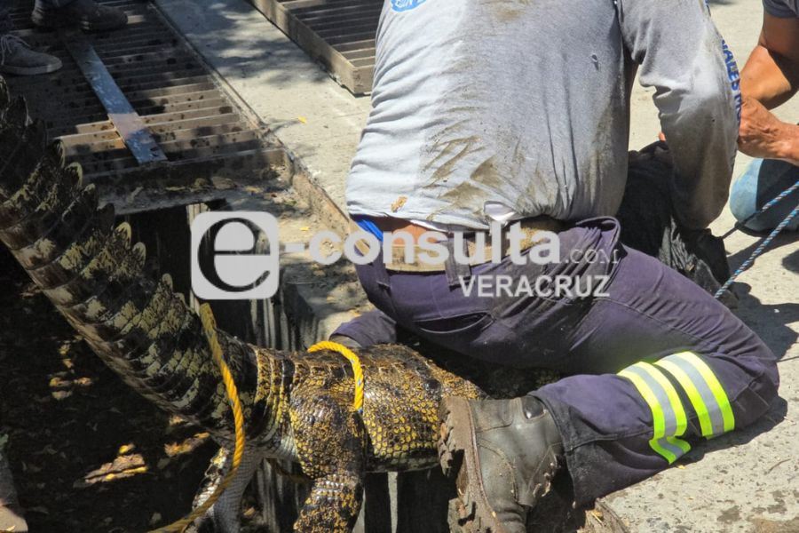 Después, personal del sistema de agua llegó y desoldó la rejilla del tragatormentan, entonces uno de los elementos de Protección Civil, se metió y logró asegurar el hocico del cocodrilo, y sacarlo.