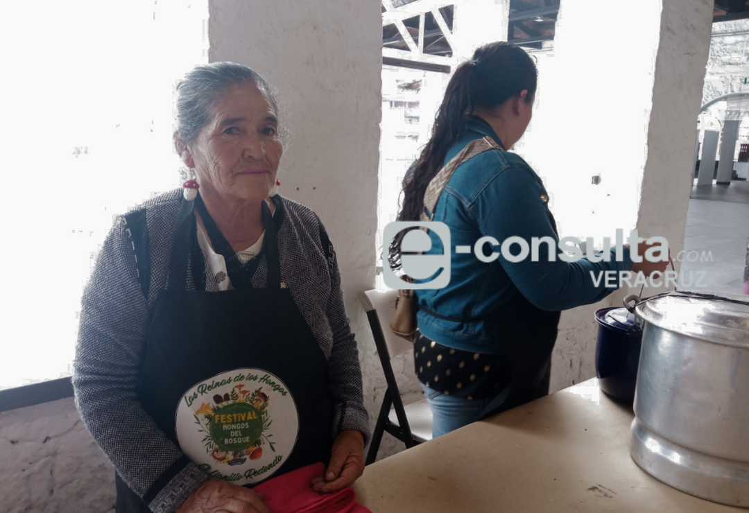 Detrás de una mesa, vistiendo un delantal con el título "Las Reinas de los Hongos", Lucía cuenta que esta es la segunda vez que llegó al Festival Hongos del Bosque de la UV para vender sus platillos junto a otras mujeres del municipio de Las Vigas de Ramírez.