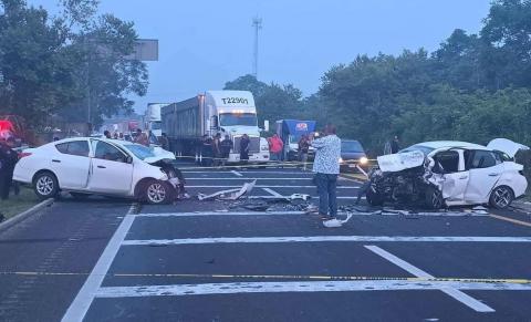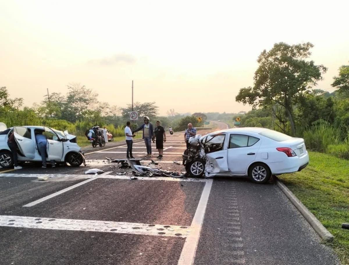 El percance ocurrió en el carril con dirección a Coatzacoalcos, a unos 200 metros del acceso a Agua Dulce, donde colisionaron un automóvil Nissan Versa blanco, con placas Y73BWH, y un Hyundai del mismo color, este último conducido por un integrante de la Guardia Nacional (GN).