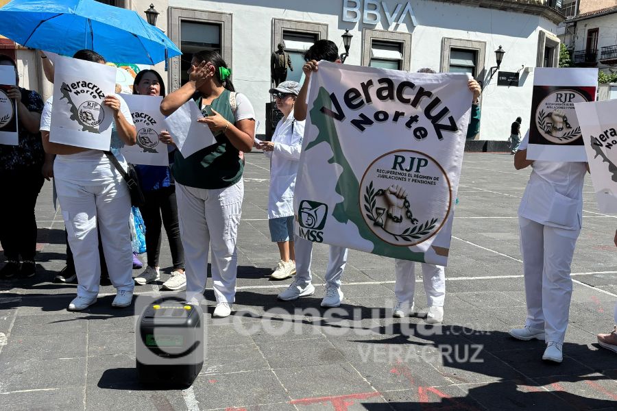 Xalapa, Ver.- Los trabajadores del Instituto Mexicano del Seguro Social (IMSS) protestaron en la capital del estado de Veracruz, para exigir un Régimen de Jubilaciones y Pensiones (RJP) seguro y digno, ante la incertidumbre que les genera el actual sistema de la Administradora de Fondos para el Retiro (Afore).