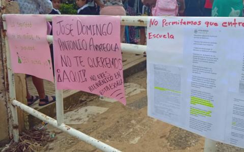 Durante la manifestación, realizada la mañana de este lunes 1 de septiembre, los padres colocaron pancartas en el portón de la escuela con mensajes como: “No estamos de acuerdo que el profesor José Domingo esté de director por sus más de 60 denuncias”.