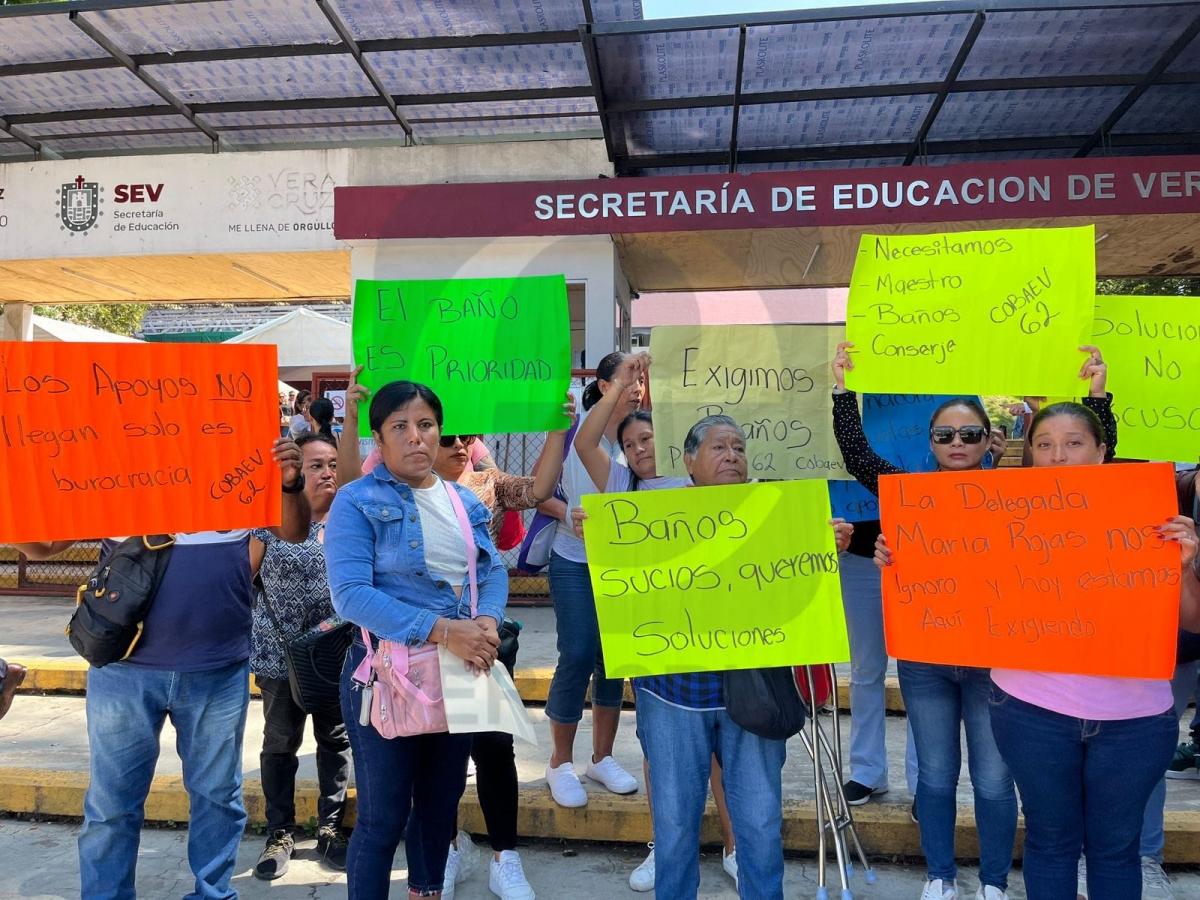 Xalapa, Ver.- Padres de familia del Colegio de Bachilleres del Estado de Veracruz (Cobaev) número 62, ubicado en la zona norte del puerto de Veracruz, se manifestaron este viernes 5 de septiembre en las instalaciones de la Secretaría de Educación de Veracruz (SEV) para exigir la construcción de nuevos baños y la contratación de personal de intendencia.