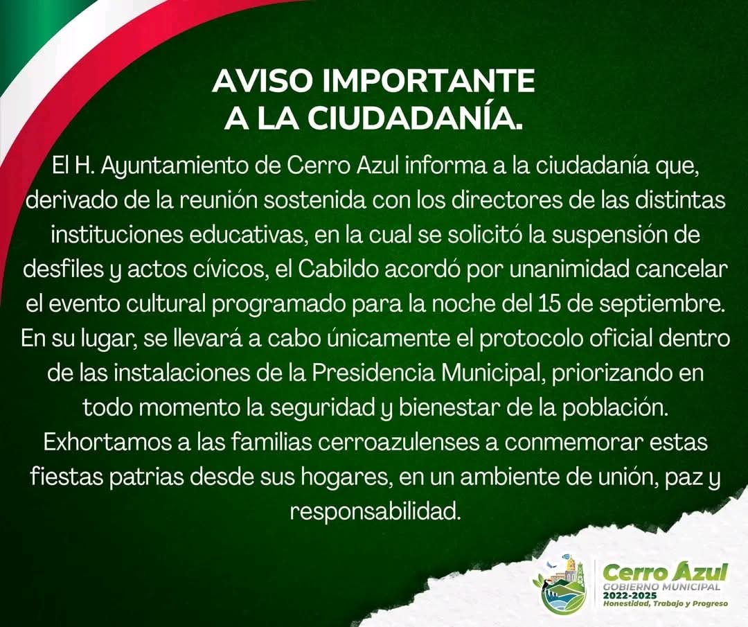 Cerro Azul, Ver.- El Ayuntamiento de Cerro Azul, en la zona norte de Veracruz, anunció la cancelación de actividades culturales, desfiles y actos cívicos relacionados con el 215 aniversario del inicio de la Independencia de México, debido a la inseguridad registrada en la región huasteca.