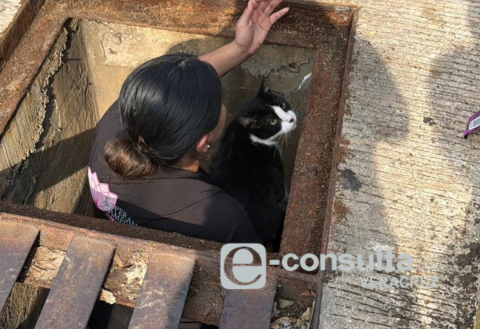 Rescatan a “Cheto”, gato atrapado en un registro en Coatzacoalcos