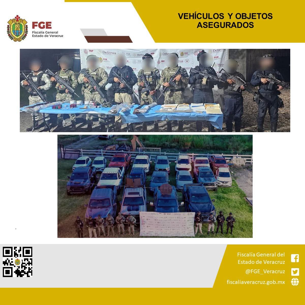Tierra Blanca, Ver.– Derivado de un operativo realizado por fuerzas federales y estatales en la congregación Paso Coyote, municipio de Tierra Blanca, permitió el aseguramiento de 19 vehículos —varios de ellos blindados—, armamento, cartuchos, drogas y otros objetos relacionados con actividades ilícitas, informó la Fiscalía General del Estado de Veracruz (FGE).
