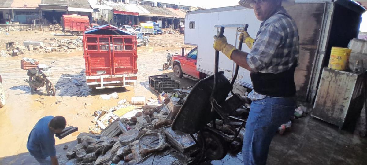 En el lugar, el ambiente es desolador. Entre el lodo y los restos de cajas, costales y frutas en descomposición, los locatarios trabajan sin maquinaria ni vehículos de carga, pues aún esperan el envío de retroexcavadoras y camiones que permitan levantar los desechos acumulados.