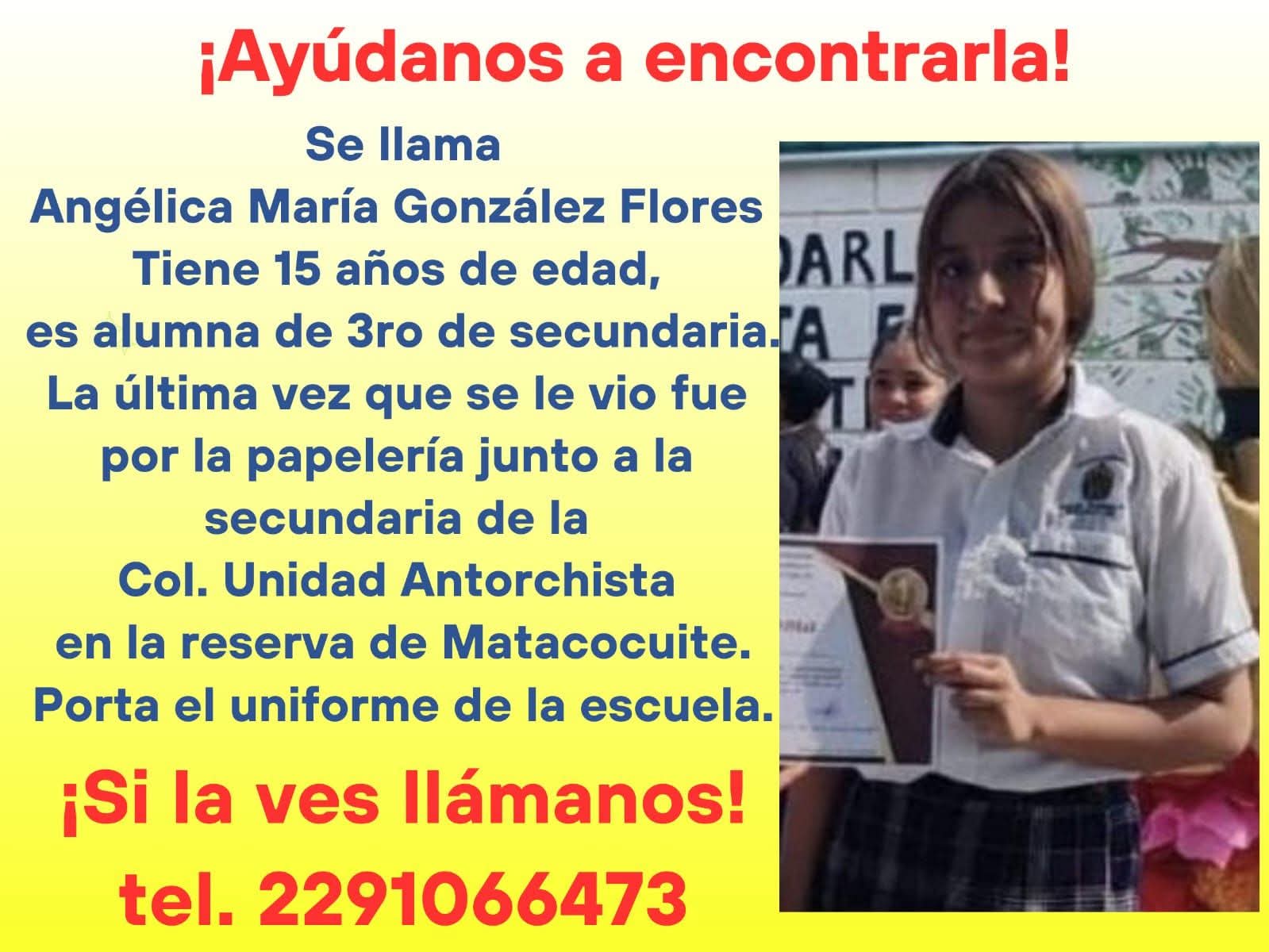 Angélica María es estudiante de tercer grado de secundaria. Al momento de desaparecer llevaba puesto el uniforme. Su familia indicó que cualquier dato que dé la ciudadanía, servirá para dar con el paradero de la menor de edad y puede ser reportado al teléfono 2291066473 o al número de emergencias 911.