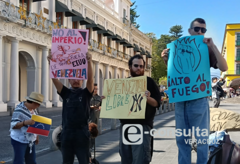 Xalapa, Ver.— “Alto al fuego”, “no al imperio”, “fuera Estados Unidos de Venezuela”, se leía en las pancartas de la manifestación de ciudadanos en la plaza Sebastián Lerdo de Tejada la mañana de este sábado 3 de enero en el centro de la ciudad de Xalapa, Veracruz.