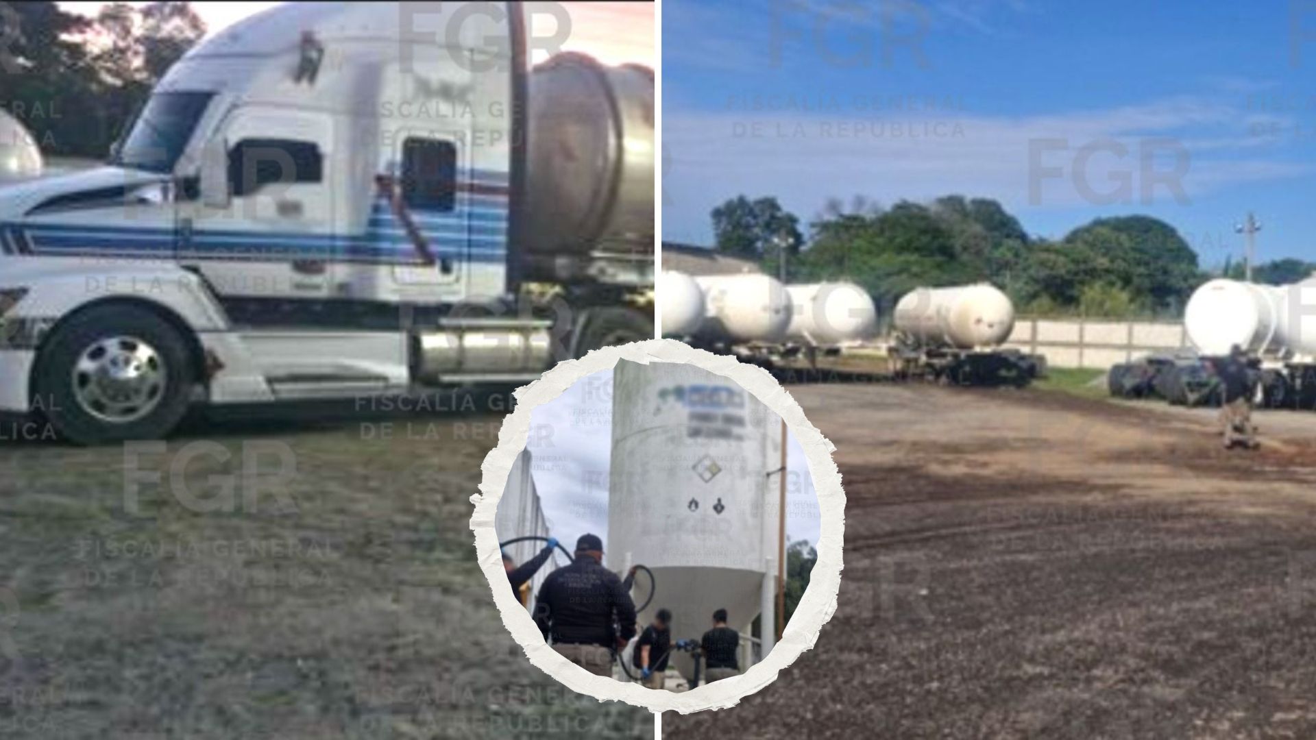 En un segundo domicilio, durante el cateo correspondiente, se aseguraron dos tanques fijos, 41 semirremolques tipo tanque, 18 autotanques y siete tractocamiones.