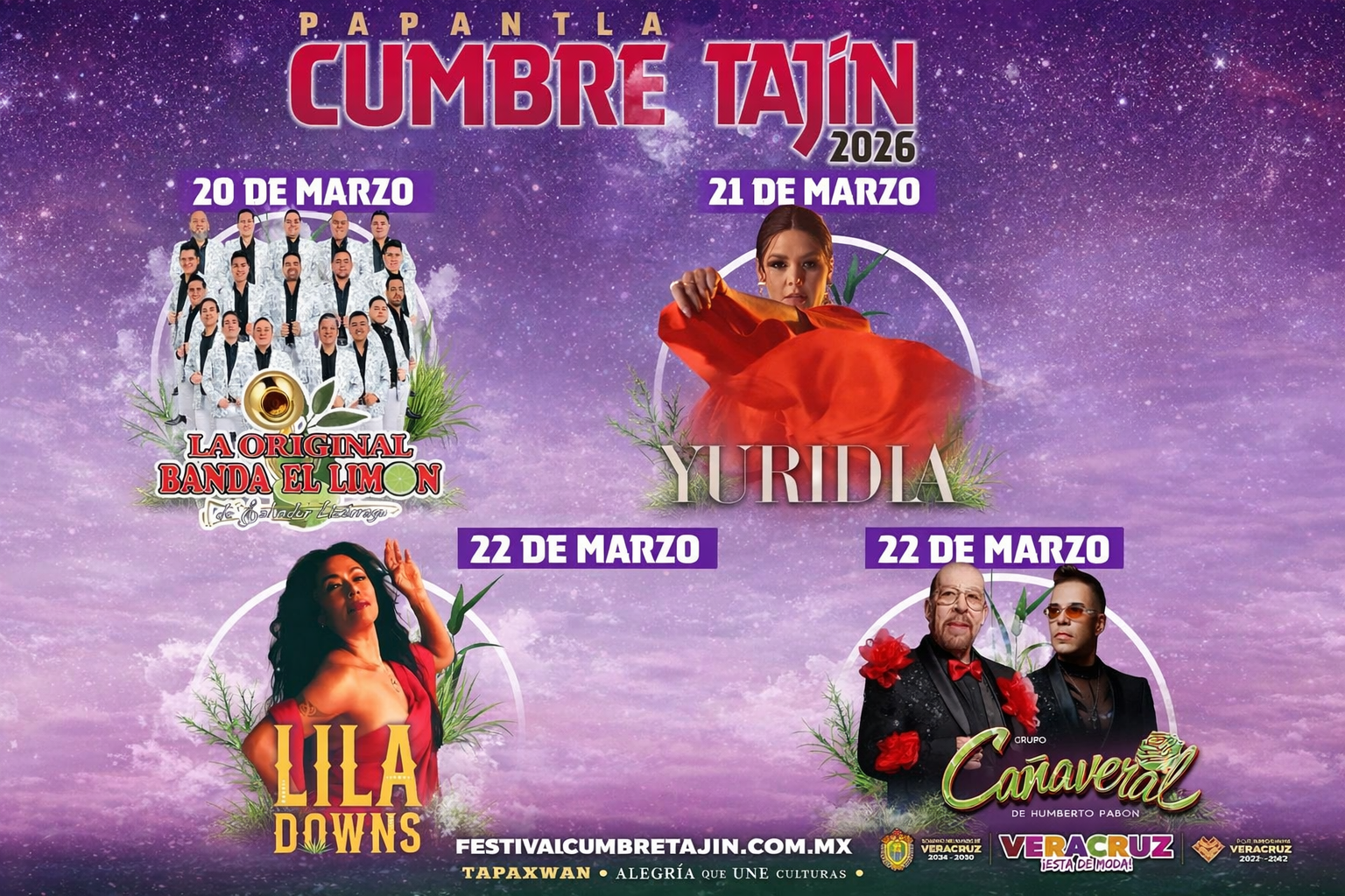 Xalapa, Ver.- La gobernadora de Veracruz, Rocío Nahle García, dio a conocer la cartelera oficial de Cumbre Tajín 2026, que se realizará del 20 al 22 de marzo en Papantla, en la región del Totonacapan.