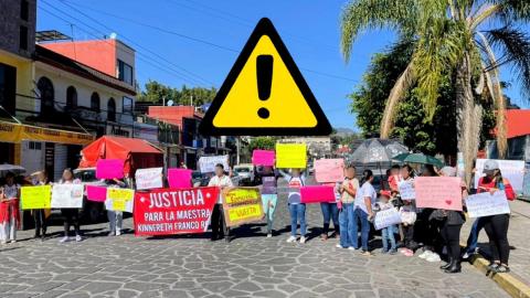 Con una manta con la leyenda “Justicia para la maestra Kinnereth Franco Rojas”, los inconformes aseguraron que las acusaciones por presunta discriminación son falsas y pidieron justicia.