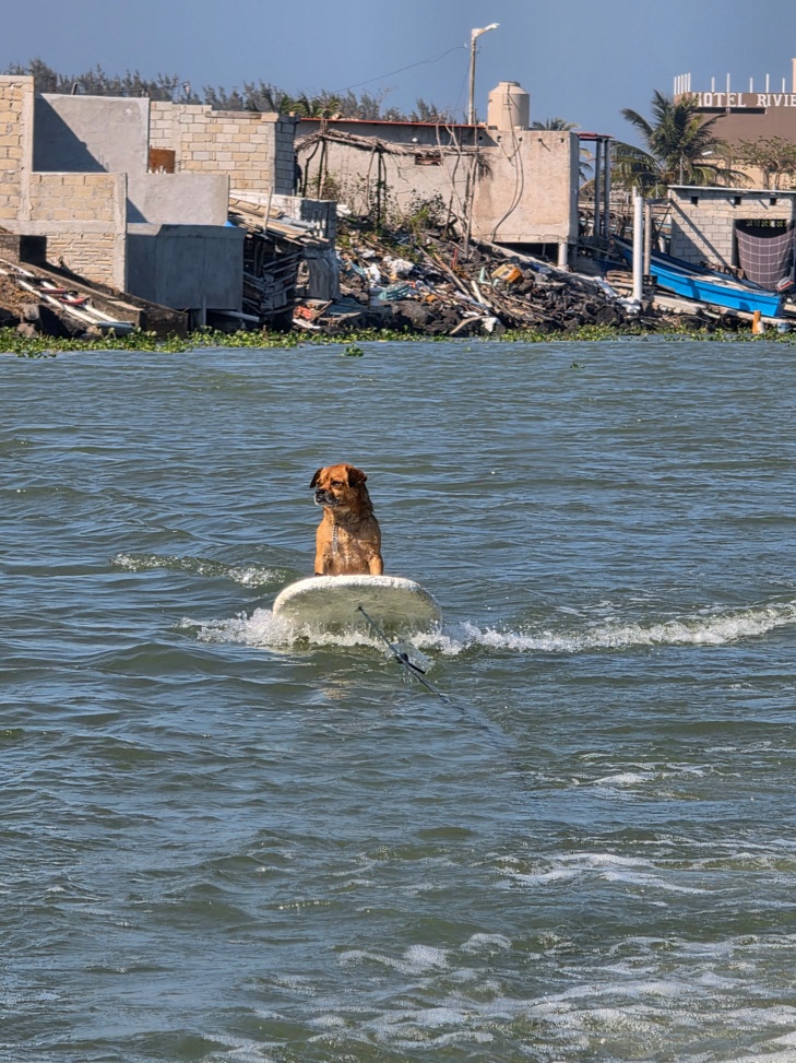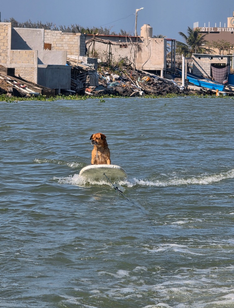 La embarcación comienza a adentrarse en el Golfo de México y, si el mar está tranquilo, Hugo saca la tabla que le hizo con unicel. Tenía otra hecha de fibra de vidrio, con la que Marihuano se sentía más cómodo, pero la marejada se la llevó durante un frente frío, así que ahora el perrito surfea en la herramienta improvisada.