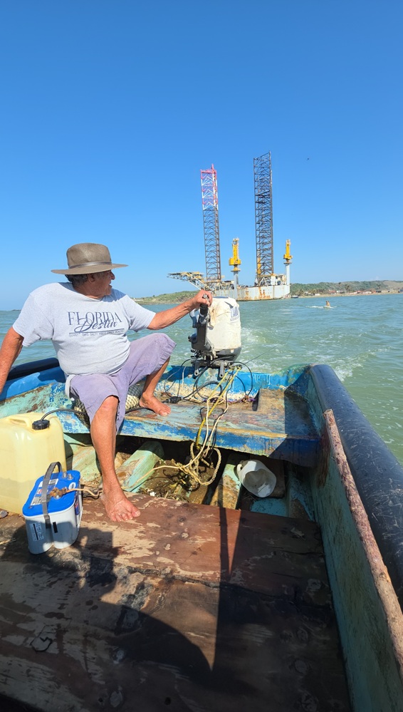 “Entonces, pues lo traigo suelto y lo enseño a subirse por motores, se enseñó a subirse la tabla a la lancha. Con el surfeo, cada vez que lo agarro, lo llevo al río. Voy de algún lado. Me ayuda a levantar las redes. Él me ayuda a jalar, aguantar, agarra las redes y muerde la malla de los pescados, se tira al agua queriendo agarrarlos, pero no puede”, narra su amo.