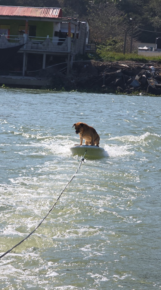 Marihuano mueve las patas traseras hasta que se acomoda; después se sienta, levanta la vista y sus orejas comienzan a moverse conforme aumenta la velocidad. El perrito se balancea con las olas que impactan la tabla, hasta que una más grande lo hace caer.