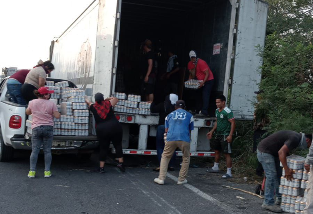 Mientras las autoridades realizaban labores de auxilio y control de la circulación, personas que llegaron al sitio comenzaron con la rapiña de la mercancía, principalmente cartones y paquetes de cerveza que transportaba el tráiler involucrado en el accidente.