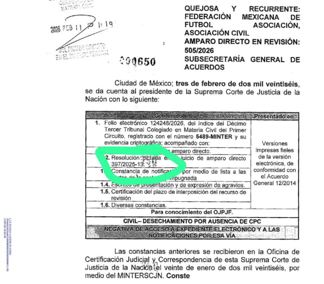De acuerdo con el folio electrónico 12248 del amparo directo en revisión 505/2026, la determinación fue emitida por la Subsecretaría General de Acuerdos del máximo tribunal del país y quedó registrada el pasado 3 de febrero de 2026.