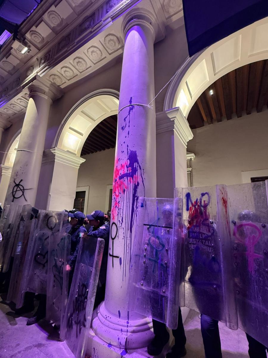 Sin embargo, durante el recorrido algunas manifestantes –entre ellas integrantes del llamado bloque negro– realizaron pintas y rompieron cristales en distintos puntos del trayecto. En paredes y fachadas escribieron consignas en contra de la violencia de género y también nombres de presuntos agresores, deudores alimentarios y señalados por violencia sexual.