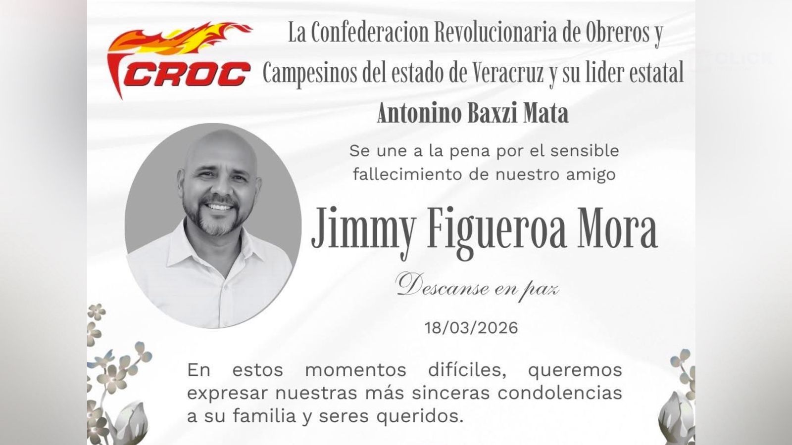 Tierra Blanca, Ver.Jimmy Figueroa Mora, líder sindical de la CROC, fue hallado muerto el miércoles 18 de marzo en este municipio, con heridas de arma punzocortante.