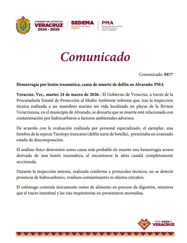 Por su parte, el Gobierno de Veracruz informó que el delfín encontrado sin vida en playas de la Riviera Veracruzana, en el municipio de Alvarado, murió por una hemorragia provocada por una lesión traumática, luego de que su aleta caudal fuera seccionada.