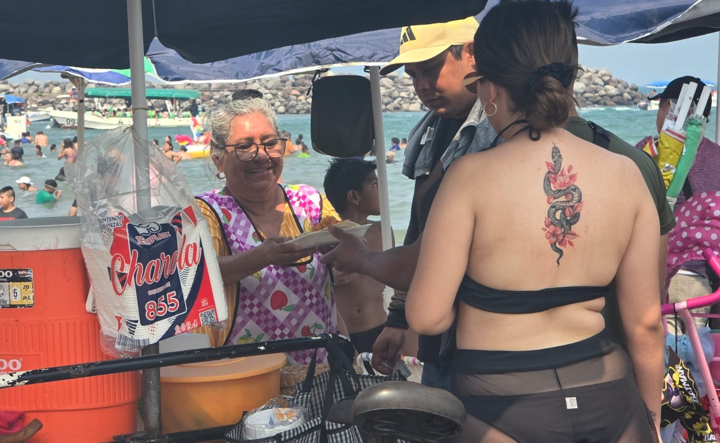 Hace un cuarto de siglo, Noemí decidió dejar de trabajar para un patrón y apostar por su propio negocio. Desde entonces, su triciclo recorre la playa ofreciendo una variedad de guisados que pocos esperan encontrar frente al mar.