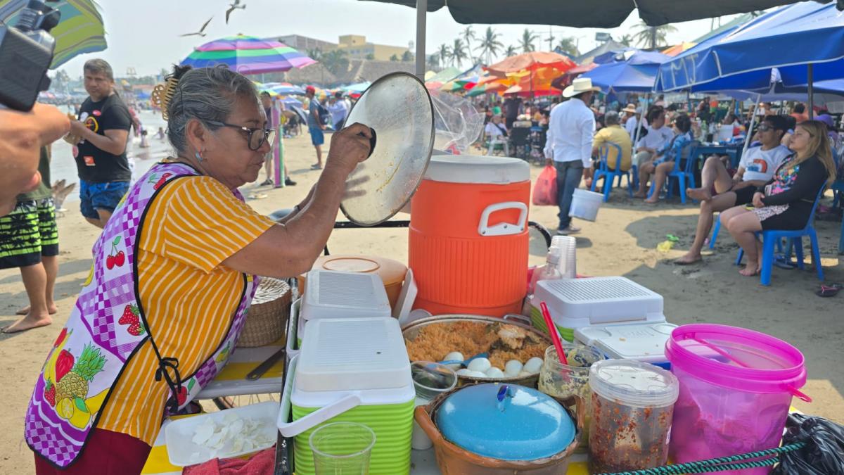 Xalapa, Ver.- Entre la arena y el ruido de las olas, Noemí Sánchez Flores empuja trabajosamente su triciclo adaptado con ollas y recipientes llenos de guisados. Con 25 años vendiendo en las playas de Villa del Mar, los tacos de esta mujer de la tercera edad se ha convertido en una alternativa económica y nutritiva para los turistas que no optan por los tradicionales pescados y mariscos.
