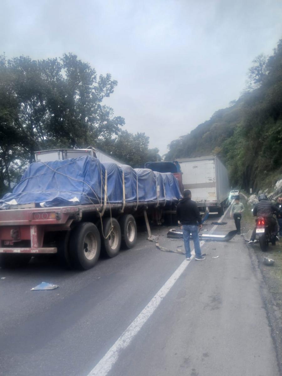 El percance ocurrió este miércoles e involucró al menos tres unidades, entre ellas un tractocamión cargado con cemento, un camión de servicio y un tráiler tipo caja seca, los cuales colisionaron en una zona de pendiente.