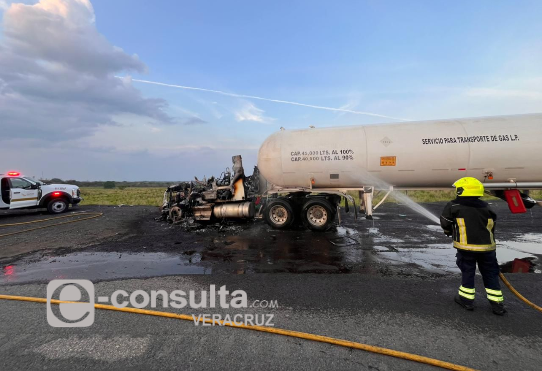 Una pipa cargada con gas LP se incendió en la autopista La Tinaja–Cosoleacaque, a la altura del municipio de Juan Rodríguez Clara.