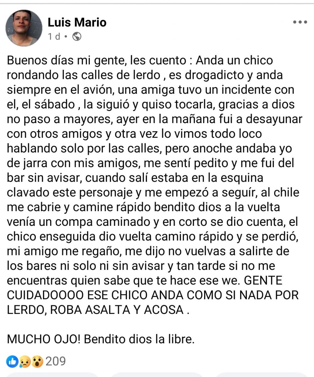 En su publicación, Luis Mario relató que el sujeto lo había seguido tras salir de un establecimiento, situación que le generó temor.