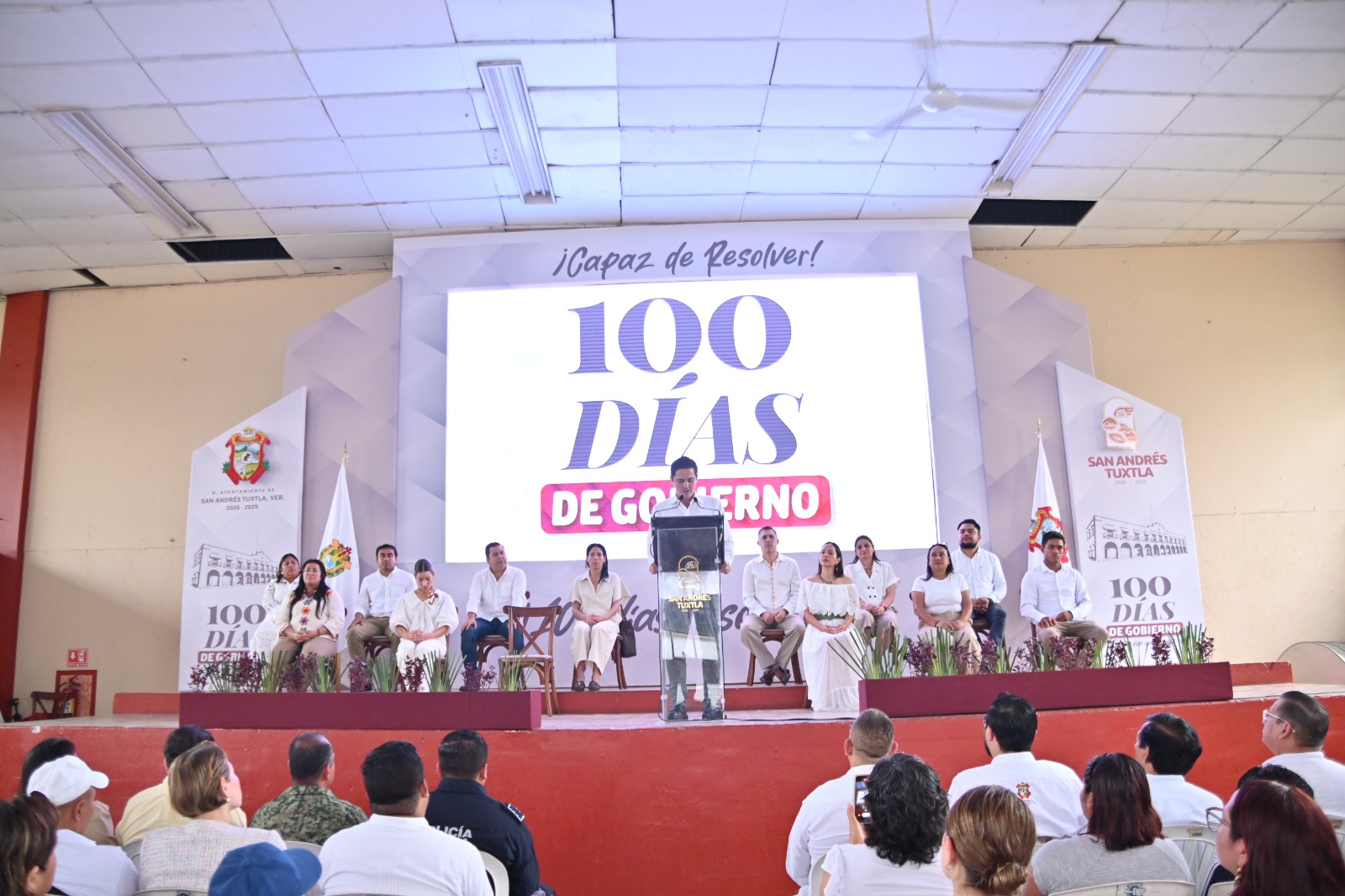 San Andrés Tuxtla, Ver., 19 de abril de 2026.- Este domingo, el presidente municipal, Rafa Fararoni Magaña rindió su informe de los primeros 100 días de Gobierno Municipal ante la ciudadanía sanadrescana.