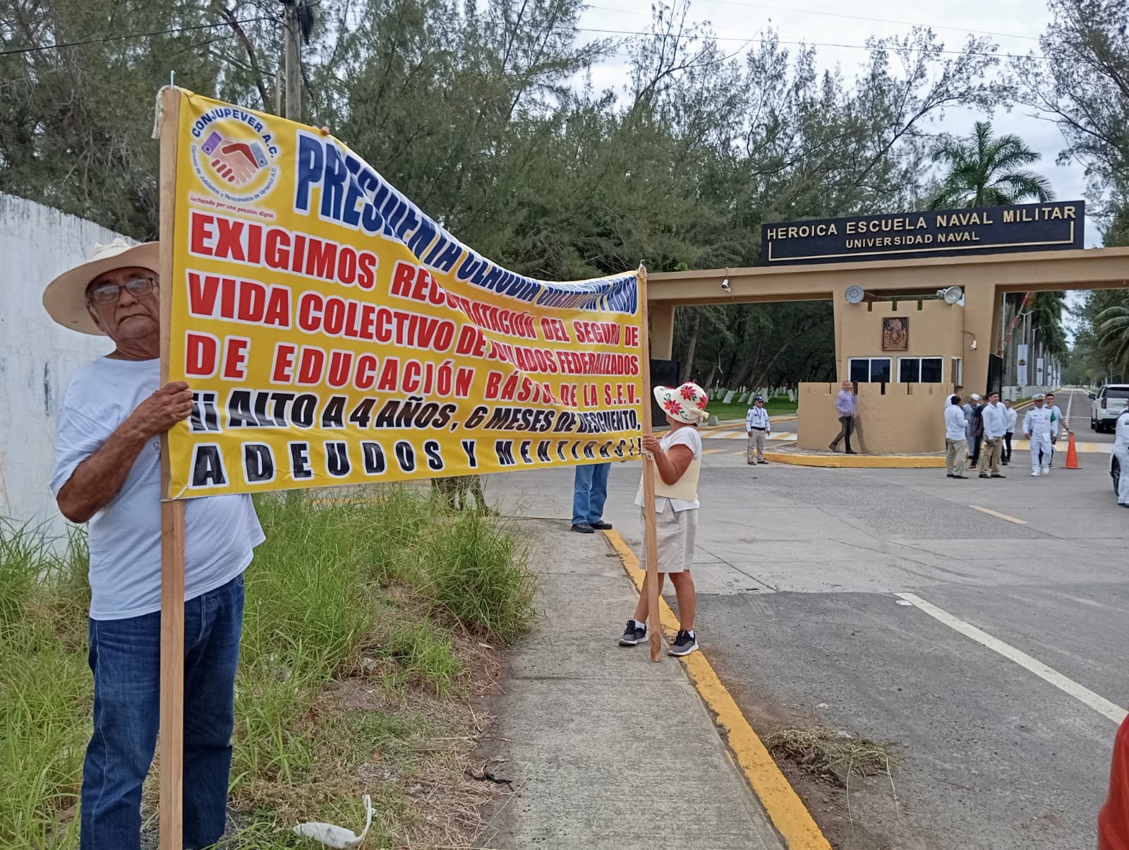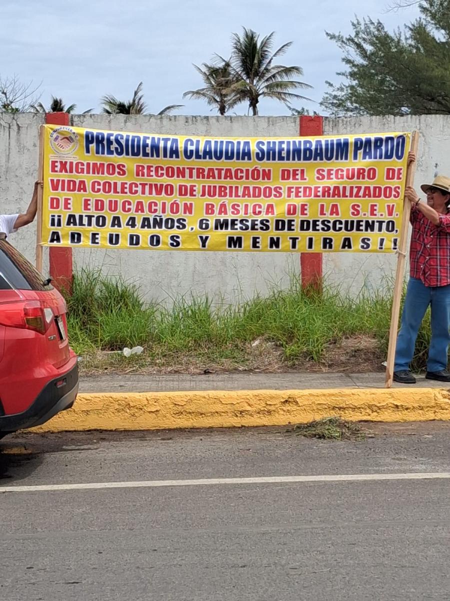 Veracruz, Ver. — Integrantes del Consejo de Jubilados y Pensionados de Veracruz (CONJUPEVER) se manifestaron a las afueras de la Heroica Escuela Naval Militar de Antón Lizardo, en el municipio de Alvarado, para solicitar el apoyo de la presidenta Claudia Sheinbaum Pardo y resolver el problema de los seguros de vida que enfrentan desde hace cuatro años.