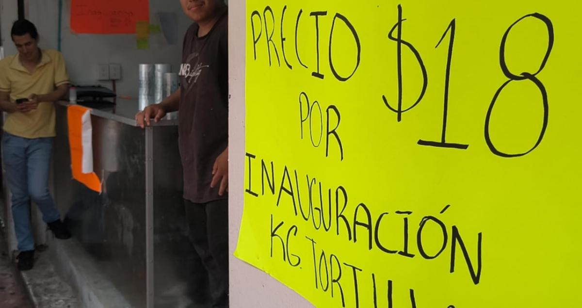 En la fachada del negocio colocó una cartulina donde se informa que el kilo de tortilla recién salida de la máquina cuesta 18 pesos, mientras que la tortilla fría se vende en 13 pesos por kilogramo.