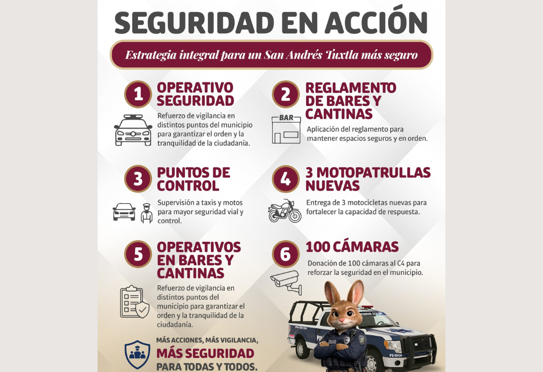 San Andrés Tuxtla, Ver., 23 de abril de 2026.- Con acciones firmes y específicas, el gobierno municipal de San Andrés Tuxtla refuerza operativos de seguridad en beneficio de la ciudadanía.