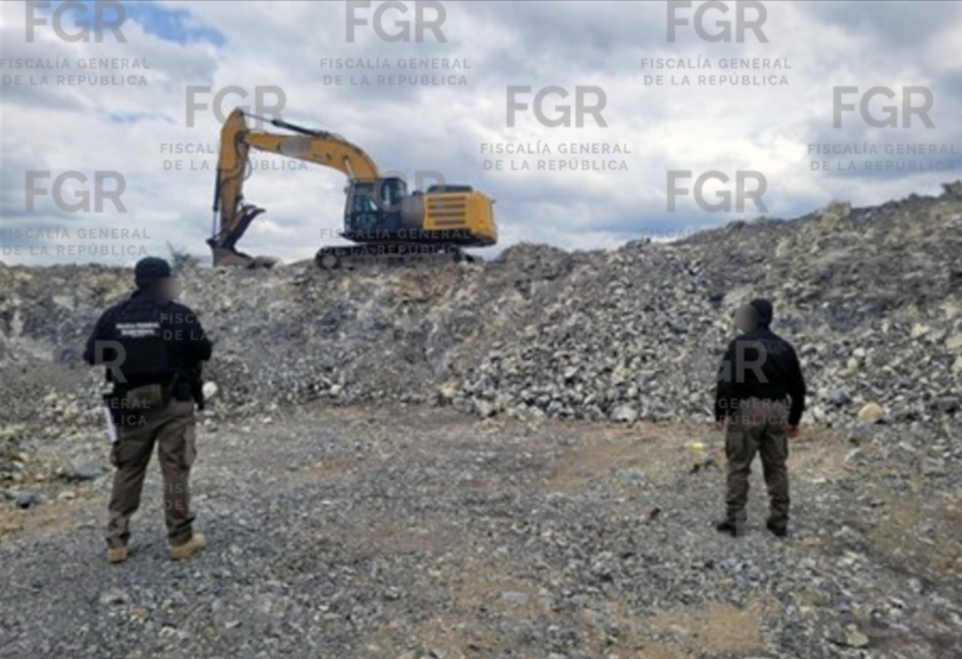 Tras un cateo a cuatro inmuebles, la FGR aseguró maquinaria y más de 6 mil metros cúbicos de grava y arena por presunta minería ilegal.